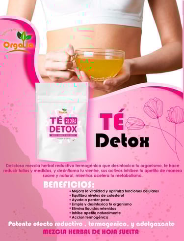 Té Detox 28 Días es una mezcla herbal termogénica formulada para desintoxicar tu organismo, reducir medidas y ayudarte a recuperar vitalidad. Sus ingredientes naturales favorecen la eliminación de toxinas, desinflaman el vientre y aceleran el metabolismo de manera suave. Ideal para quienes buscan una depuración completa y un estilo de vida más ligero.